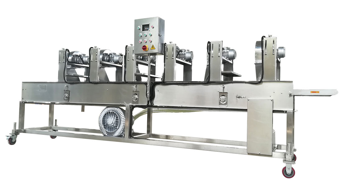 用于食品領域的真空袋和小包裝去水風干;將產品輸入輸送網帶,經強勁風力及時將包裝物表面的殘留水滴去除;主體采用進口不銹鋼制造;變頻調速控制輸送帶速度;產品自動翻滾能使產品表面水分去除風干效果貼標或直接裝箱;運行平穩、自動程度高、效率快;外形尺寸可根據客戶要求進行設計定制。